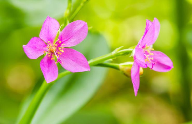 Botanically, Talinum paniculatum is a fleshy, erect herb, growing to 50 cm in height. Its leaves are in whorls, obovate-lanceolate, flat, glossy and bright green. Its flowers are in terminal panicles, small and pink coloured and are borne in lax, many-flowered branched inflorescences, bright pink, and up to about 1.2 cm in diameter. The individual flowers, on hairy stalks, are small but are nicely massed together, especially with the red bead-like buds and fruits. The fruit is a glossy dark red capsule, 3-5 mm in diameter. Jewels of Opar is native to Africa.