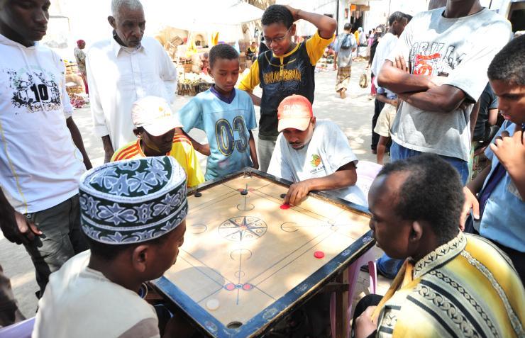 This is a board game originally from India – where it is known as carom – a curious mix of billiard and table shuffleboard. It is now played on the shores of the Indian Ocean, but also in faraway places such as the UK and North America.