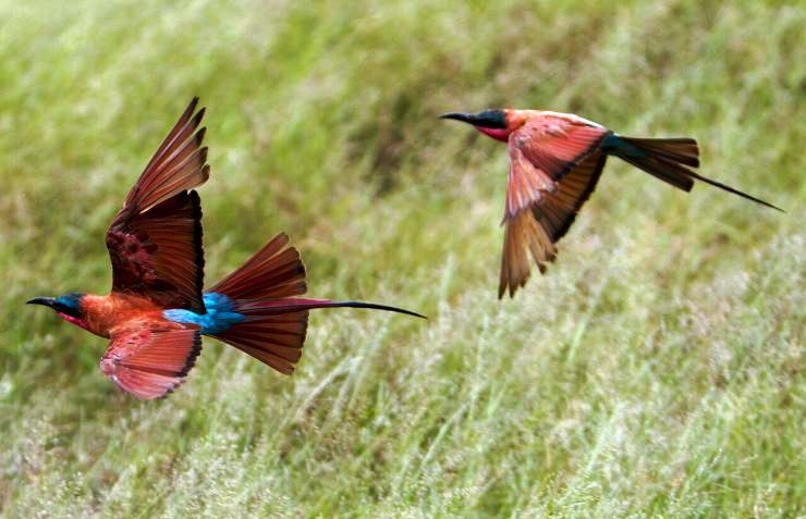 This is, in fact, the time in which a wonderful intertropical migratory bird with characteristic carmine plumage arrives in the wooded savannas of northern Zimbabwe to mate and nest, coming from northern South Africa and Mozambique, where it spends the winter – the southern carmine bee-eater (Merops nubicoides).